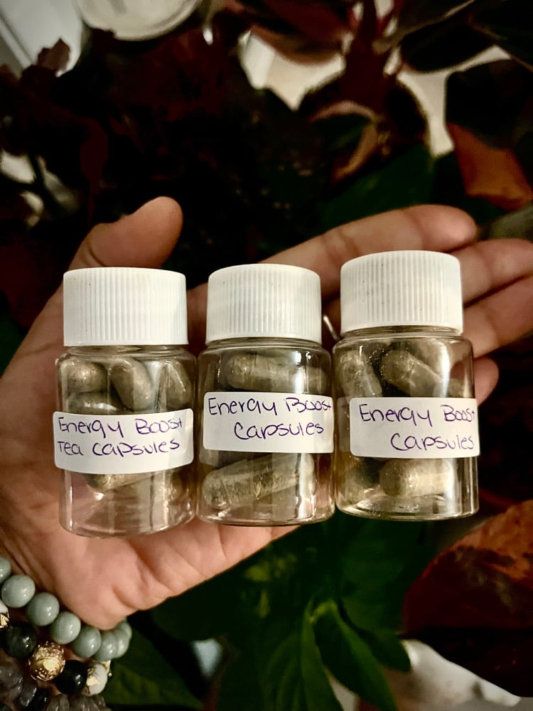 Introducing our Energy Boost Capsules. These capsules help with boosting energy, clearing away grogginess and fatigue, and help with morning anxiety. These capsules can be put into tea or taken by mouth with a glass of water.